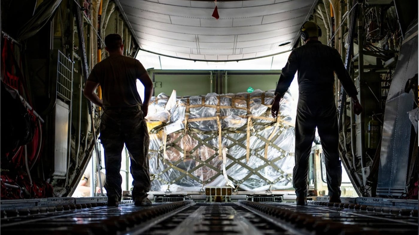 This photo provided by U.S. Air Force, U.S. Air Force loadmasters assigned to the 36th Airlift Squadron prepare to offload a pallet of cargo from a C-130J Super Hercules from the 36 AS in Saipan, Commonwealth of the Northern Mariana Islands, April 19, 2026. . (Senior Airman Tallon Bratton/U.S. Air Force via AP)
