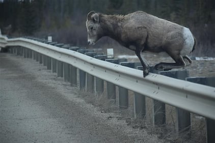 A Bighorn ram hops a guardrail in Jasper National Park. (March 5, 2026) (Dave Mitchell/CTV News Edmonton)