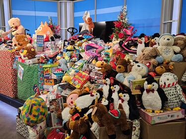CTV Kitchener Toy Mountain A smaller Toy Mountain after the Salvation Army came early to collect items at CTV Kitchener on Dec. 9, 2025.