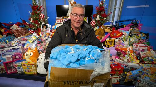Delphine and Lloyd Martin Apartments with Parkwood Community Home toy mountain Dan Cress, the news director for CTV News Kitchener, with a Toy Mountain donation from Delphine and Lloyd Martin Apartments and Parkwood Community Home on Dec. 15, 2025.