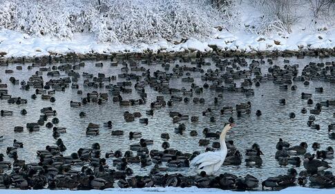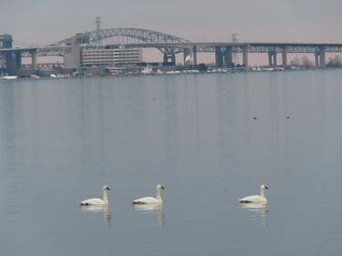 swan swans bridge LaSalle Park in Burlington winter snow Swans on the water in LaSalle Park in Burlington, Ont. on Jan. 5, 2026. (Courtesy: Karen Wood)