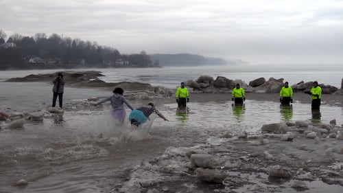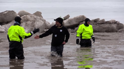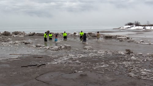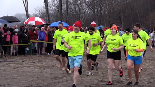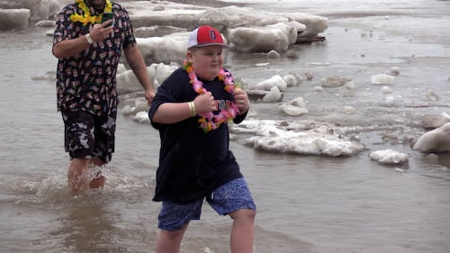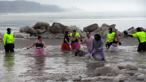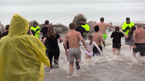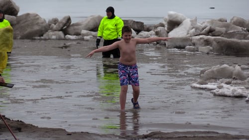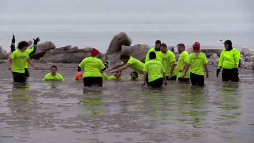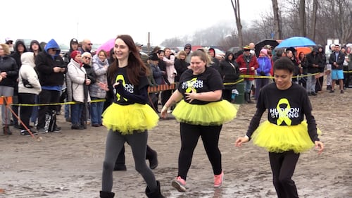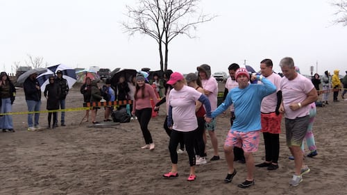 Lake Erie polar dip for Childcan Hundreds turned out to the Polar Dip in support of Childcan in Port Stanley, Ont. on March 7, 2026. (Brent Lale/CTV News London)