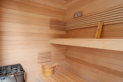 Bright Chalet, Que. The chalet's indoor sauna is lined with pale birch and includes tiered benches and a traditional wooden bucket, a standout amenity that helped land it on Vrbo's annual best-of list. (Photo: VRBO)
