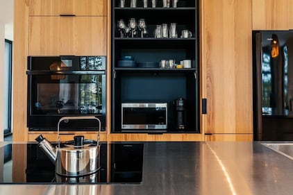 Bright Chalet , Que. The kitchen's built-in cabinetry conceals a full array of appliances including a wall oven, microwave, coffee maker and ample glassware for a group stay. (Photo: VRBO)