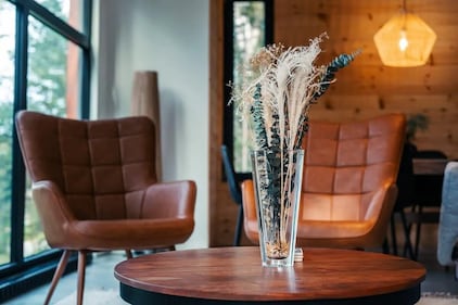 Bright Chalet , Que. A close-up of the living area's coffee table, set with dried botanicals and framed by a pair of leather armchairs. (Photo: VRBO)