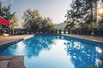 Bright Chalet , Que. The heated saltwater pool at Club de la Pointe, the resort-style facility on Lac Supérieur that Bright Chalet guests have exclusive access to. (Photo: VRBO)