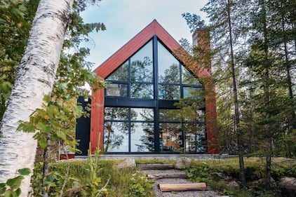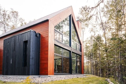 Bright Chalet, Que. The Bright Chalet in Lac-Supérieur, Que., one of Vrbo's 2026 Vacation Rentals of the Year, features striking floor-to-ceiling windows framed by red cedar siding, tucked among birch and pine trees in the Laurentians. (Photo: VRBO)