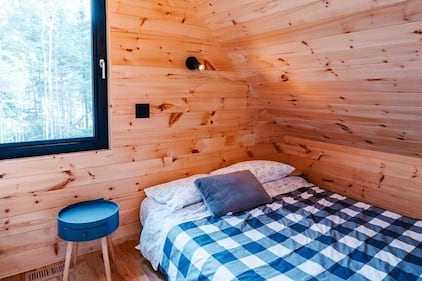 Bright Chalet , Que. A second bedroom under the sloped roofline is wrapped in natural pine with a forest-facing window letting in the light. (Photo: VRBO)