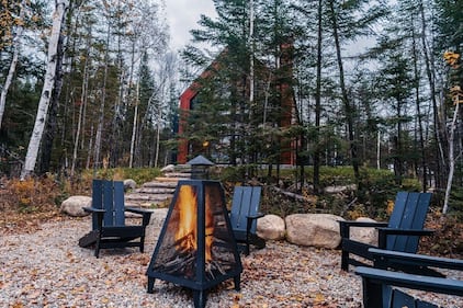 Bright Chalet, Que. A fire pit surrounded by Adirondack chairs sits on the gravel terrace below the chalet, with the property's red cedar facade visible behind the trees. (Photo: VRBO)