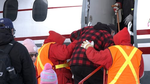Kashechewan First Nation - evac An elder is helped aboard a planes as members of Kashechewan First Nation board an evcationation on Jan. 15, 2026, amid the community's ongoing water crisis. (Lydia Chubak/CTV News Northern Ontario)