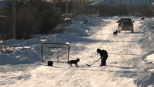 Kashechewan First Nation A child plays street hockey along a roadway in the half evacuated Kashechewan First Nation on Jan. 15, 2026, amid the community's ongoing water crisis. (Lydia Chubak/CTV News Northern Ontario)