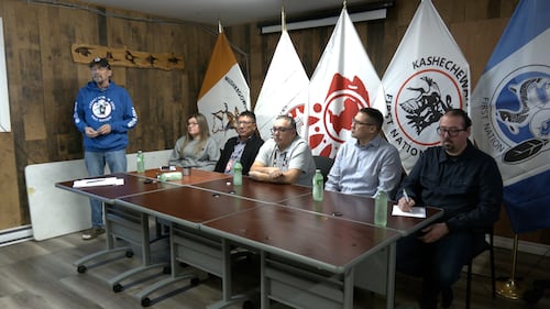 Indigenous leaders - Kashechewan First Nation Indigenous leaders gather on Kashechewan First Nation on Jan. 15, 2026, amid the community's ongoing water crisis. (Lydia Chubak/CTV News Northern Ontario)