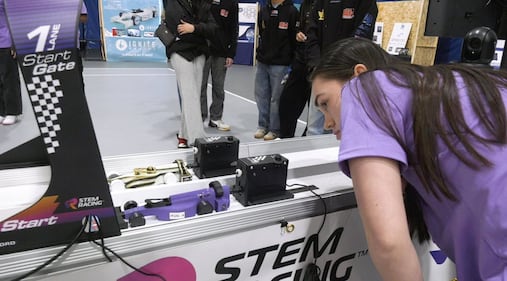 STEM Racing 2026 Canadian National Championships A student inspecting model cars before a race at the STEM Racing 2026 Canadian National Championships. April 11, 2026 (Eric Taschner/CTV News Northern Ontario)