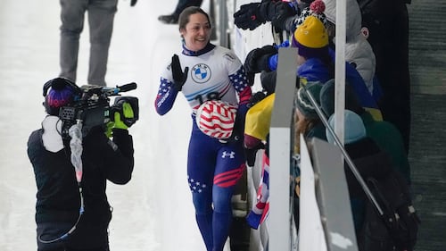 Katie Uhlaender, of the United States, center, greets fans after finishing her second run during a World Cup skeleton competition in Lake Placid, N.Y., Thursday, March 21, 2024. (AP Photo/Seth Wenig)