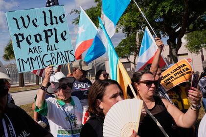 Demonstrators gather in front of the Orange County Corrections Department during a May Day rally for worker and immigrant rights Thursday, May 1, 2025, in Orlando, Fla. (AP Photo/John Raoux)