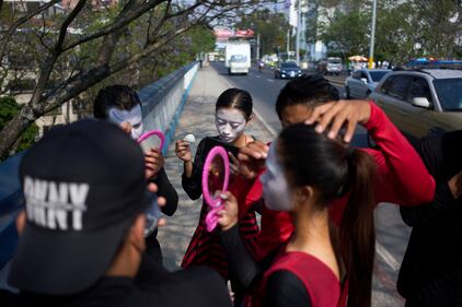 Street artists apply mime makeup as they prepare to march in the annual International Workers' Day, marking May Day in Guatemala City, Thursday, May 1, 2025. (AP Photo/Moises Castillo)