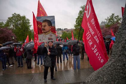 Russian Communist Party's supporters with a portrait of former Soviet leader Josef Stalin and red flags gather to mark Labor Day, also known as May Day, at the monument to 19th century German philosopher Karl Marx, near Red Square in Moscow, Russia, Thursday, May 1, 2025. (AP Photo/Alexander Zemlianichenko)
