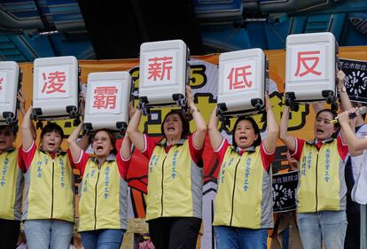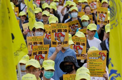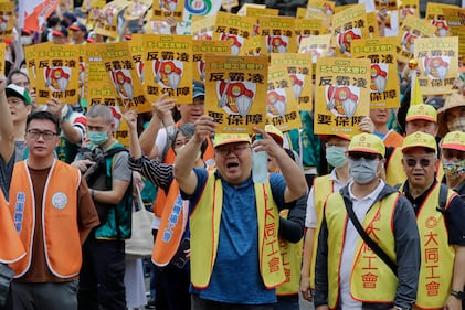 Taiwanese workers hold slogans reading " Anti-low-wage bullying '' during a May Day rally in Taipei, Taiwan, Thursday, May 1, 2025. (AP Photo/Chiang Ying-ying)
