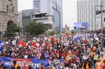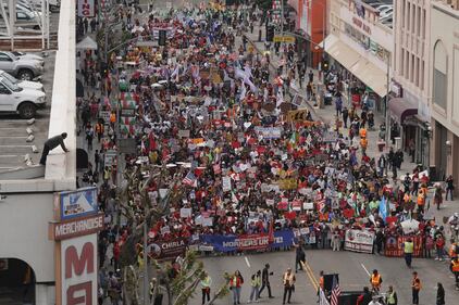 Demonstrators march during a May Day protest Thursday, May 1, 2025, in Los Angeles. (AP Photo/Jae C. Hong)