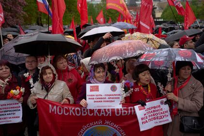 Russian Communist Party's supporters with poster reading "Our goal is socialism, our banner is red", "first and most importantly - we all work for victory!" gather to mark Labor Day, also known as May Day, at the monument to 19th century German philosopher Karl Marx, near Red Square in Moscow, Russia, Thursday, May 1, 2025. (AP Photo/Alexander Zemlianichenko)