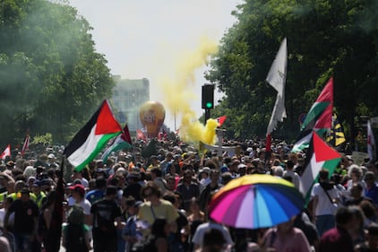 Protesters march during the May Day demonstration, Thursday, May 1, 2025 in Paris. (AP Photo/Thibault Camus)