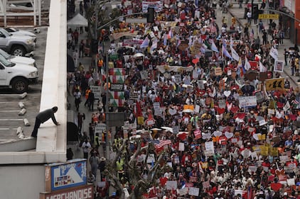 A man leans over the edge of a parking structure to watch demonstrators march during a May Day protest Thursday, May 1, 2025, in Los Angeles. (AP Photo/Jae C. Hong)