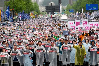 Members of the Korean Confederation of Trade Unions gather to attend a rally on May Day in Seoul, South Korea, Thursday, May 1, 2025. The letters read "Let's win basic labor rights." (AP Photo/Ahn Young-joon)