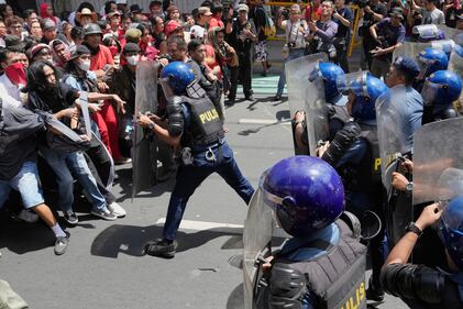Activist and workers are blocked by police as they tried to march towards the Malacanang presidential palace during a May Day rally in Manila, Philippines, Thursday, May 1, 2025. (AP Photo/Aaron Favila)