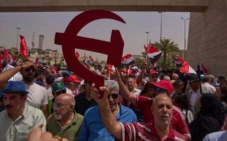 Supporters of the Iraqi Communist Party they take part in the May Day celebration in Baghdad, Iraq, Thursday, May 1, 2025. (AP Photo/Hadi Mizban)