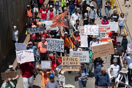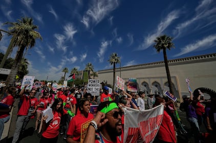 Demonstrators march during a May Day protest at the Capitol, Thursday, May 1, 2025, in Phoenix. (AP Photo/Matt York)