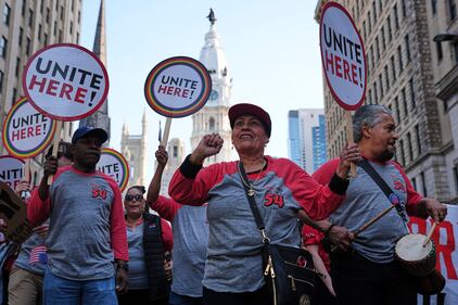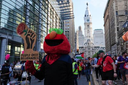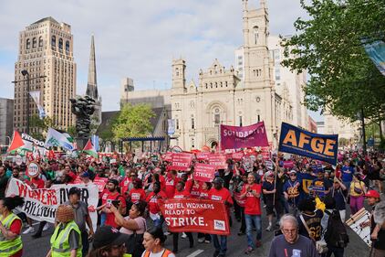 Demonstrators march during a May Day rally in Philadelphia, Thursday, May 1, 2025. (AP Photo/Matt Rourke)