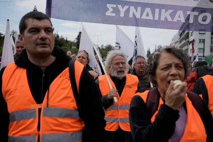 Members of the communist party-affiliated PAME shout slogans during a May Day rally in Athens, Greece, Thursday, May 1, 2025. (AP Photo/Thanassis Stavrakis)
