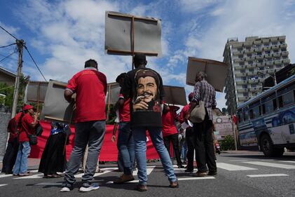 A member of the Frontline Socialist Party parade wears a T-shirt printed with a portrait of Marxist revolutionary figure Ernesto Che Guevara during a Labor Day march in Colombo, Sri Lanka, Thursday, May 1, 2025. (AP Photo/Eranga Jayawardena)