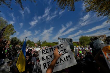 Demonstrators gather during a May Day protest at the Capitol, Thursday, May 1, 2025, in Phoenix. (AP Photo/Matt York)