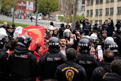 Union members are surrounded by Turkish police officers as they march during Labor Day celebrations in Istanbul, Turkey, Thursday, May 1, 2025. (AP Photo/Khalil Hamra)