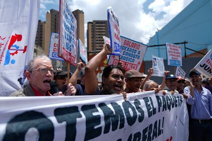 Union workers, retirees and teachers take part in an International Workers' Day march marking May Day, in Caracas, Venezuela, Thursday, May 1, 2025. (AP Photo/Ariana Cubillos)
