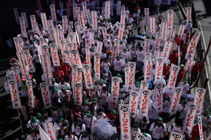Activists and workers hold banners of the Trade Union Congress of the Philippines during a May Day rally in Manila, Philippines, Thursday, May 1, 2025. (AP Photo/Aaron Favila)
