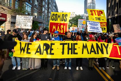 People lead the NYCLU's May Day rally for worker's and immigrant's rights as they march through the Financial District, Thursday, May 1, 2025, in New York. (AP Photo/Angelina Katsanis)