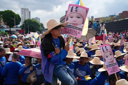 A pro-government supporter holds up a sign with the image of Maikelys Espinoza, a 2-year-old in US custody whose parents were deported separately, at a May Day rally in Caracas, Venezuela, Thursday, May 1, 2025. (AP Photo/Ariana Cubillos)