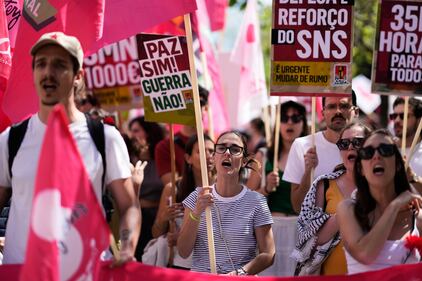 People carrying posters and flags shout slogans during a May Day demonstration in Lisbon, Thursday, May 1, 2025. (AP Photo/Armando Franca)