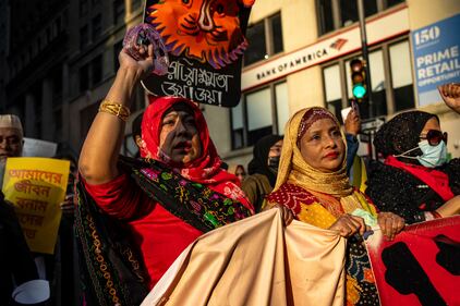 Women part of the Desis Rising Up and Moving movement hold signs and protest during the NYCLU's May Day march for worker's and immigrant's rights through the Financial District, Thursday, May 1, 2025, in New York. (AP Photo/Angelina Katsanis)