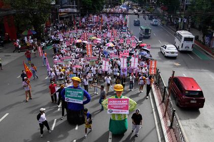 Activist wearing costumes with writing reading "P200 additional to wages", right, and "P200 additional to wages, put into law now" join a march during a May Day rally in Manila, Philippines, Thursday, May 1, 2025. (AP Photo/Aaron Favila)