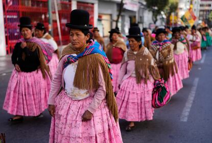 Women take part in an International Workers' Day march marking May Day in La Paz, Bolivia, Thursday, May 1, 2025. (AP Photo/Juan Karita)