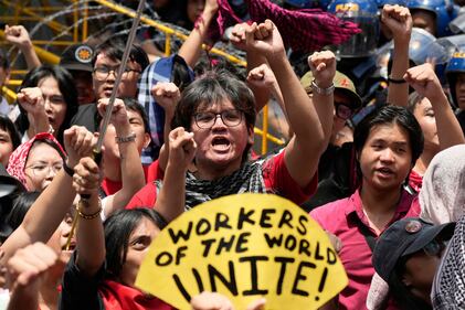 Activist and workers raise their clenched fists during a May Day rally in Manila, Philippines, Thursday, May 1, 2025. (AP Photo/Aaron Favila)
