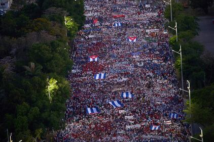 Cubans march to Revolution Square to mark May Day, in Havana, Thursday, May 1, 2025. (AP Photo/Ramon Espinosa)