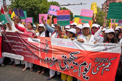 Members of a labor union take part in a rally to mark May Day, Lahore, Pakistan, Thursday, May 1, 2025. Banner reads "Labor Solidarity Day"(AP Photo/K.M. Chaudary)
