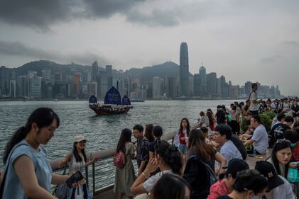 Visitors to the Tsim Sha Tsui harbor front take in the sights during the May Day holiday in Hong Kong, Thursday, May 1, 2025. (AP Photo/Bertha Wang)