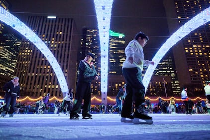 Visitors skate on the opening night of the annual Cavalcade of Lights at Nathan Phillips Square, in Toronto, on Saturday, Nov. 29, 2025. THE CANADIAN PRESS/Sammy Kogan