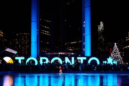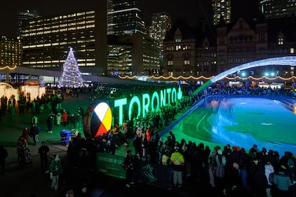 Visitors stand by the Toronto sign as they wait for the ice to be resurfaced on the opening night of the annual Cavalcade of Lights at Nathan Phillips Square, in Toronto, on Saturday, Nov. 29, 2025. THE CANADIAN PRESS/Sammy Kogan