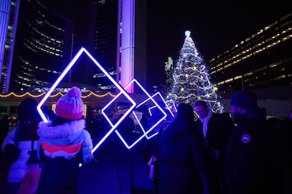 Visitors explore light exhibits on the opening night of the annual Cavalcade of Lights at Nathan Phillips Square, in Toronto, on Saturday, Nov. 29, 2025. THE CANADIAN PRESS/Sammy Kogan